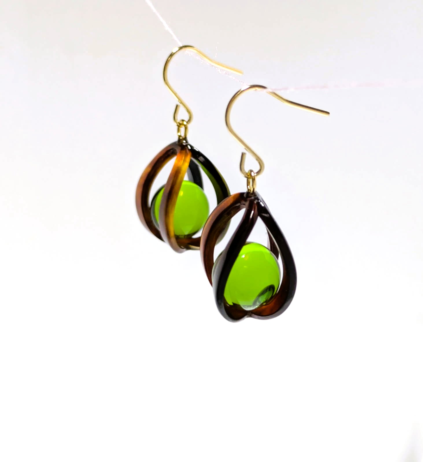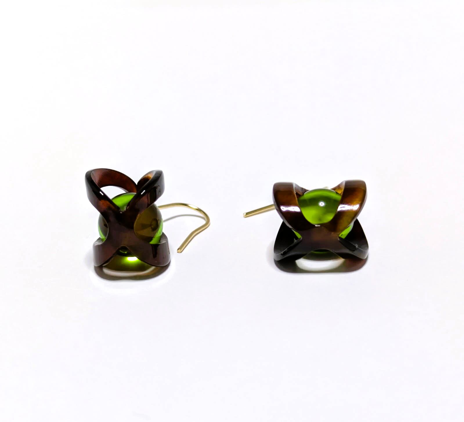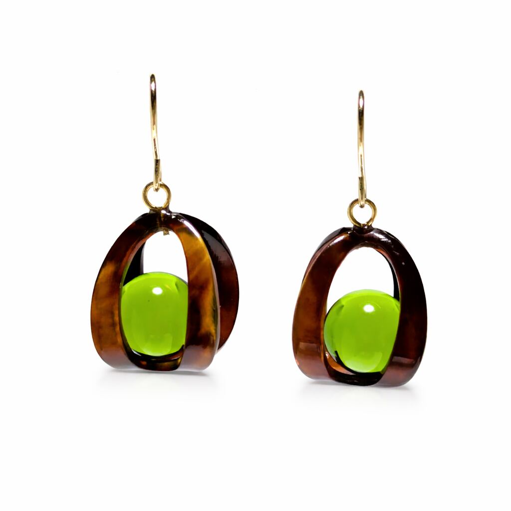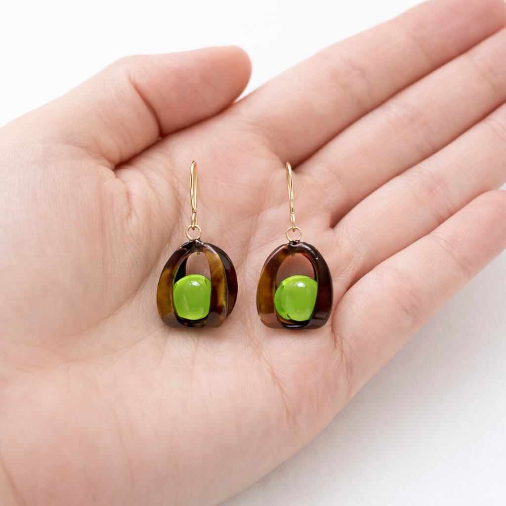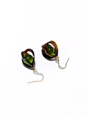 艶やかなべっ甲枠に、透明感のある**グリーンアンバー(琥珀)**を組み合わせた、大人のためのピアスです。
